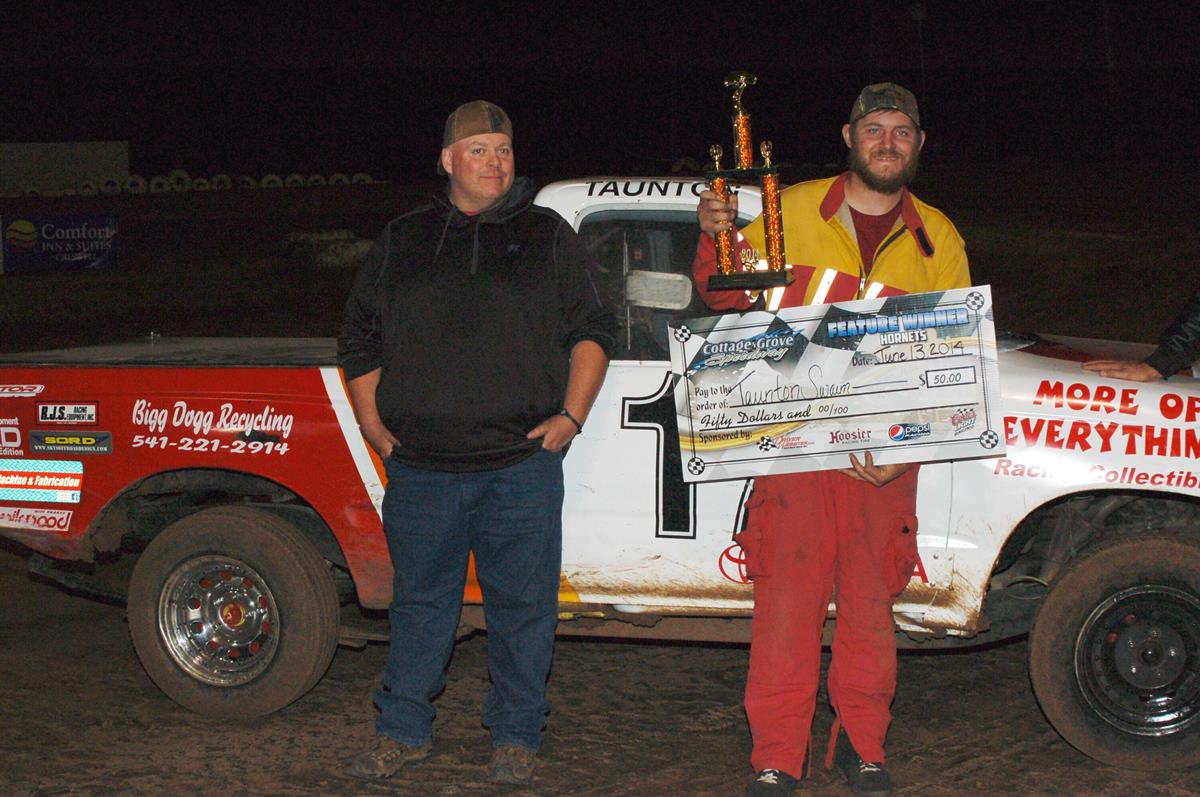 In the Hornets Chris Pierce of Cottage Grove led for much of the race before mechanical problems would force the #28 Chevy Cavalier to surrender the lead. Junction City’s Marcel Forté would inherit the top spot in the Junction City Muffler Shop/Guaranty Chevrolet/Forté Motorsports/Twisted Bit Arena #23F Nissan Centra. But Forté would lose the lead on a restart to Taunton Swaim. Swaim, of Dexter, would lead the rest of the distance to pick up his fourth win of the year at Cottage Grove for truck owner Randy Kuhl and the Bigg Dogg Recycling/DT Machine & Fabrication/Big B Tire/Rapid Delivery Service #17 Toyata Tacoma team.