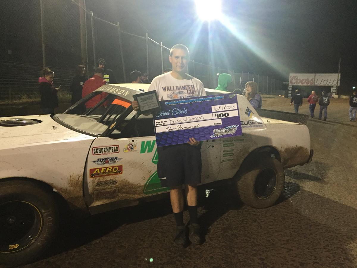 It would take Corvallis chauffeur Kevin Williamson eight laps to get in the top place position in the Street Stock main. Williamson would then take care of business and distance himself from the main body of the pack to win the race. It was the first feature win for the Eugene Mortgage Brokers/Furniture Options/Royalty Homes #W7 team in 2016 at Cottage Grove.