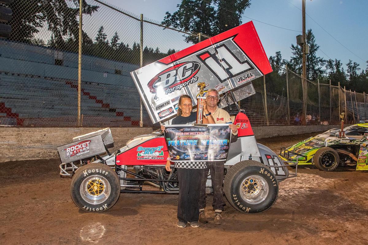 Brian would stay out in front and would earn the inaugural Senior Sprint main event. It is the first time that the veteran racer has won in the state of Oregon and at Cottage Grove. It is also the one-hundred-eightieth victory of his decorated career. David Marble was second while the Ed and Monica Sim owned entry, driven by Cottage Grove’s Chris Rolfe, got third. The rest of the top five consisted of Springfield chauffeur Kevin Journey, in fourth, and fifth finishing Gene Ashley, from Jasper.