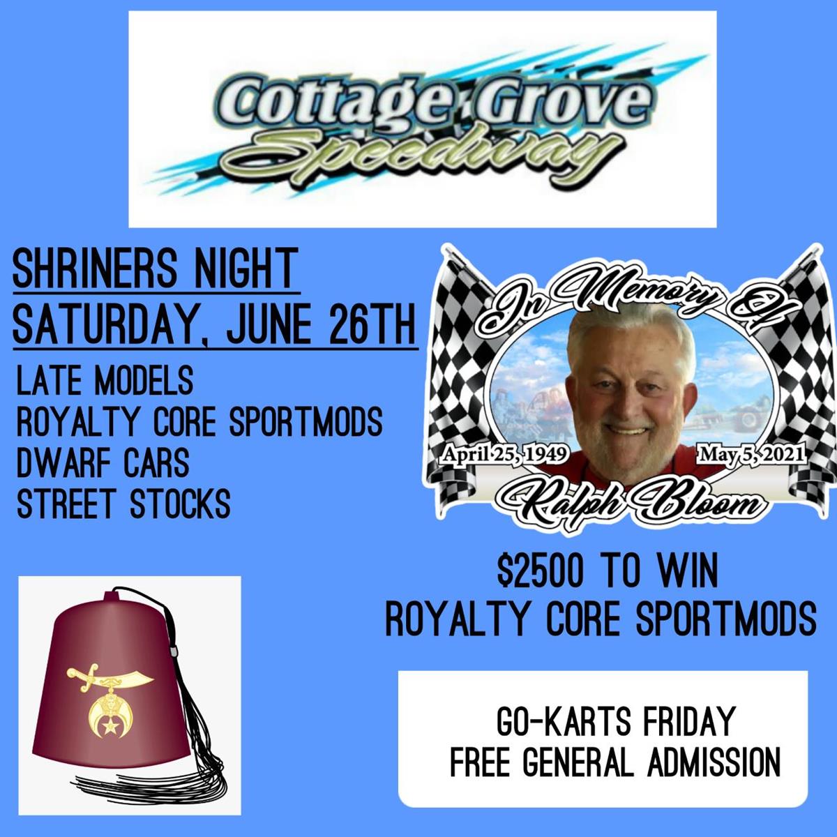 Late Models, Street Stocks, and Dwarf Cars will be on hand fighting for the title of Shriner's Cup Champion and the Royalty Core Sportmods will be doing battle for a HUGE payday in honor of the late Ralph Bloom. Bloom Family Racing has put up $2500 to win for this prestigious event and you can be sure that kind of cash will draw some hot names in Sportmod racing!