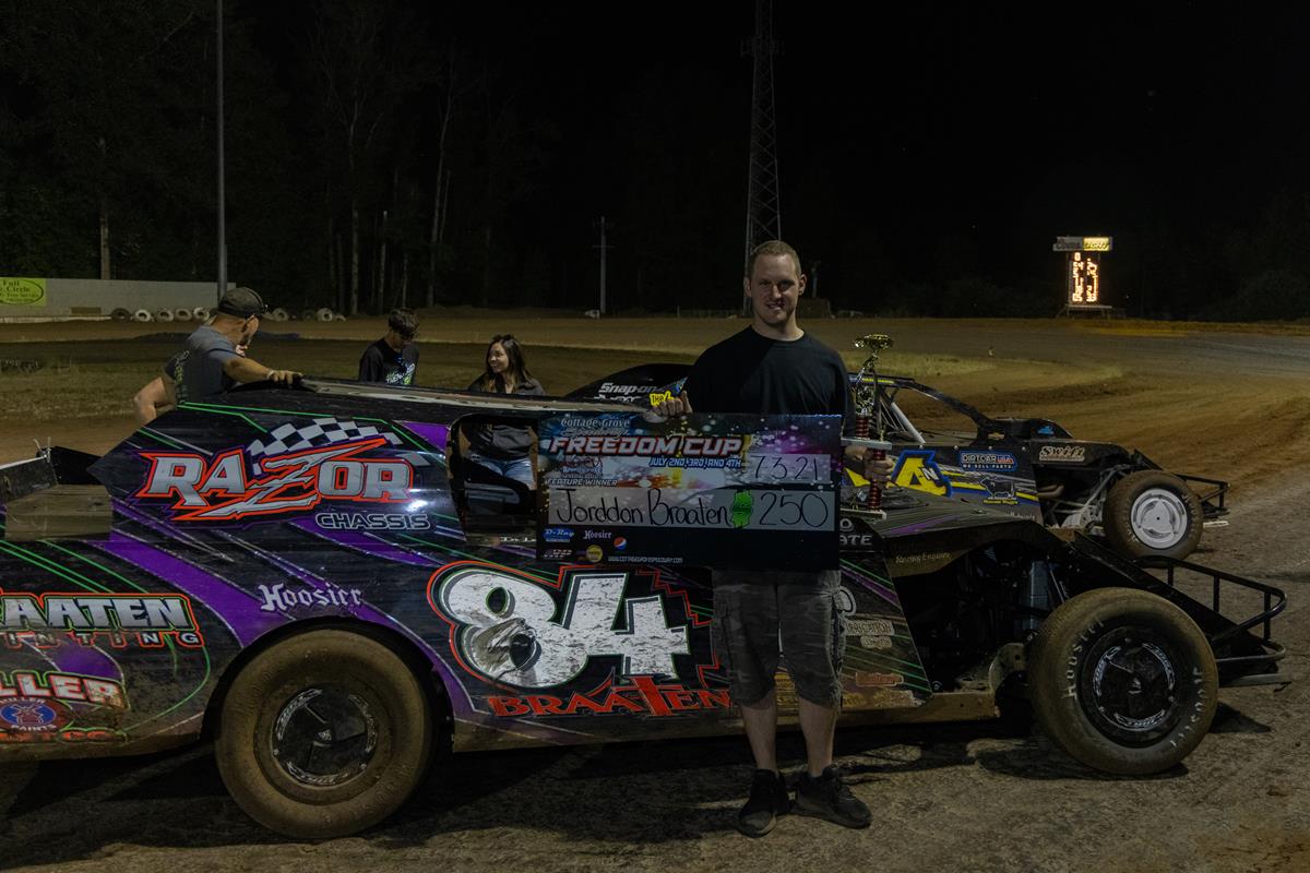 Jorddon Bratten was the one to take on the new role as the leader of the competition. Braaten dominated the rest of the distance to win for the second time in 2021 at Cottage Grove and the fourth time in the KMJ Performance Oregon scene. It is Jorddon's sixth overall Speedway Motors IMCA Weekly Racing program win. The last trip to victory lane for Braaten was on June 5th at Southern Oregon Speedway in White City.