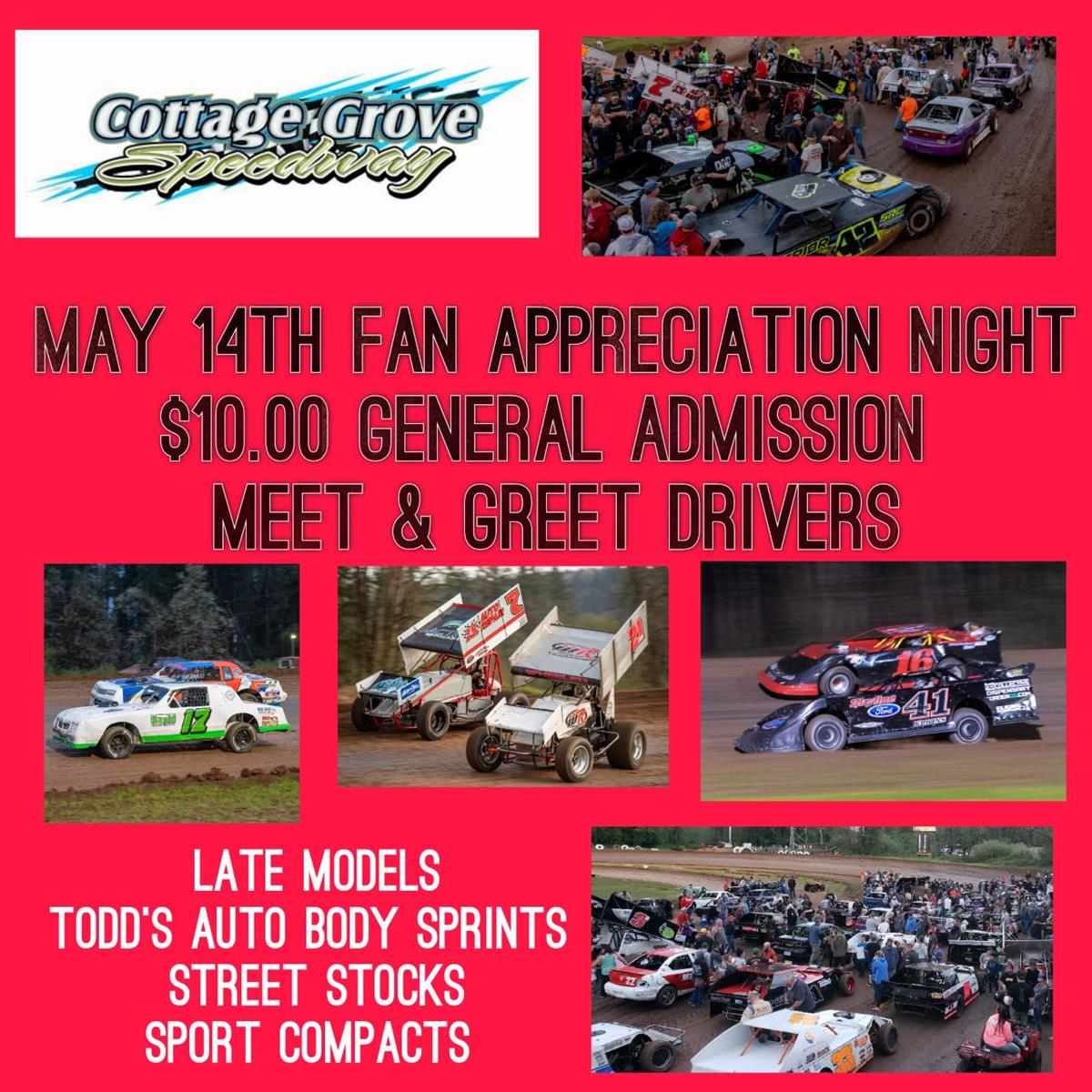 Late Models, Todd's Auto Body Sprints, Street Stocks, and IMCA Sport Compacts will all be racing on Fan Appreciation night this year, be sure to get your tickets early and be at the best show in town!