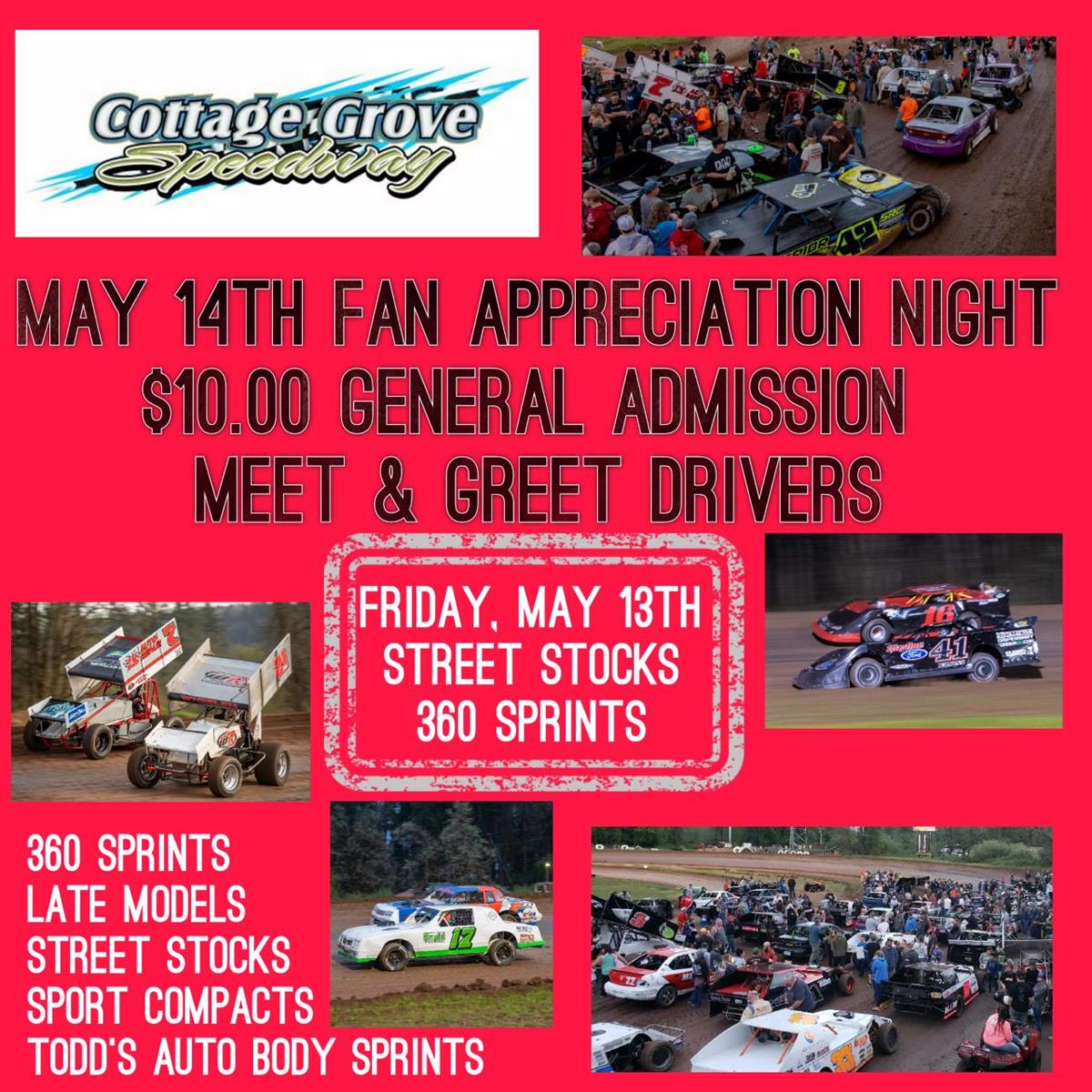 Friday is just a tease of what is to come Saturday tho!! Fan Appreciation Night is gonna be bigger than ever with the addition of 360 Sprints to the line up! In addition to Street Stocks and 360s Late Models, Todd's Auto Body Sprints, and Sport Compacts are all back! The racing is sure to be some of the best yet and if that wasn't enough, we are inviting you all to join drivers and cars on the track for an up close meet and greet! Get your favorite drivers autographs and check out these awesome racecars!! But wait there is EVEN MORE!!! Saturday Night's fan appreciation night offers general admission for just TEN BUCKS!!! There is no excuse to be anywhere else this weekend because all of the action and fun is here at Cottage Grove Speedway!!