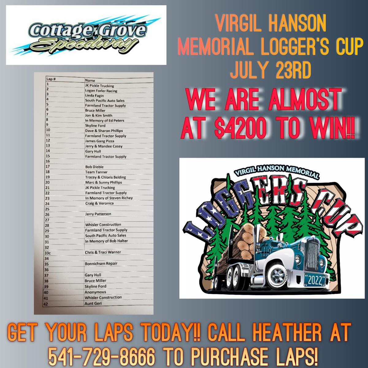 The biggest Late Model race of the year is almost here!! The Virgil Hanson Memorial Logger's Cup is July 23rd!!! Be a part of the fun and help to make this the biggest Logger's Cup yet! Laps can be purchased for $100.00 and if all 42 are sold this race will pay $4200 to win!! Call Heather at 541-729-8666 today and buy a lap or 2!!