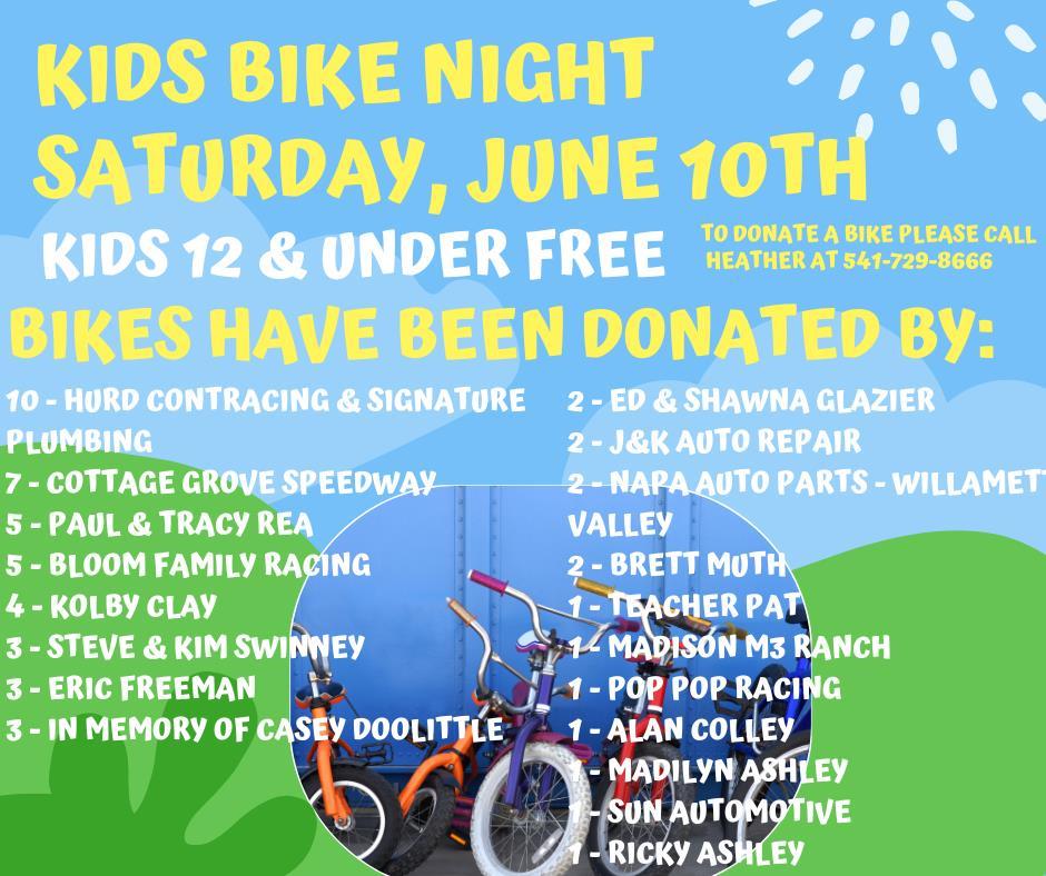 It's not too late to donate bikes either, if you want to donate just give Heather a call at 541-729-8666! Businesses, fans, drivers, anyone is welcome to be part of the fun! And in true Cottage Grove Speedway fashion we had to add a little competition to things so here are the current giveaway standings! The class with the most bikes brought in will get in additional $500 added to the purse! (Breakdown TBD)