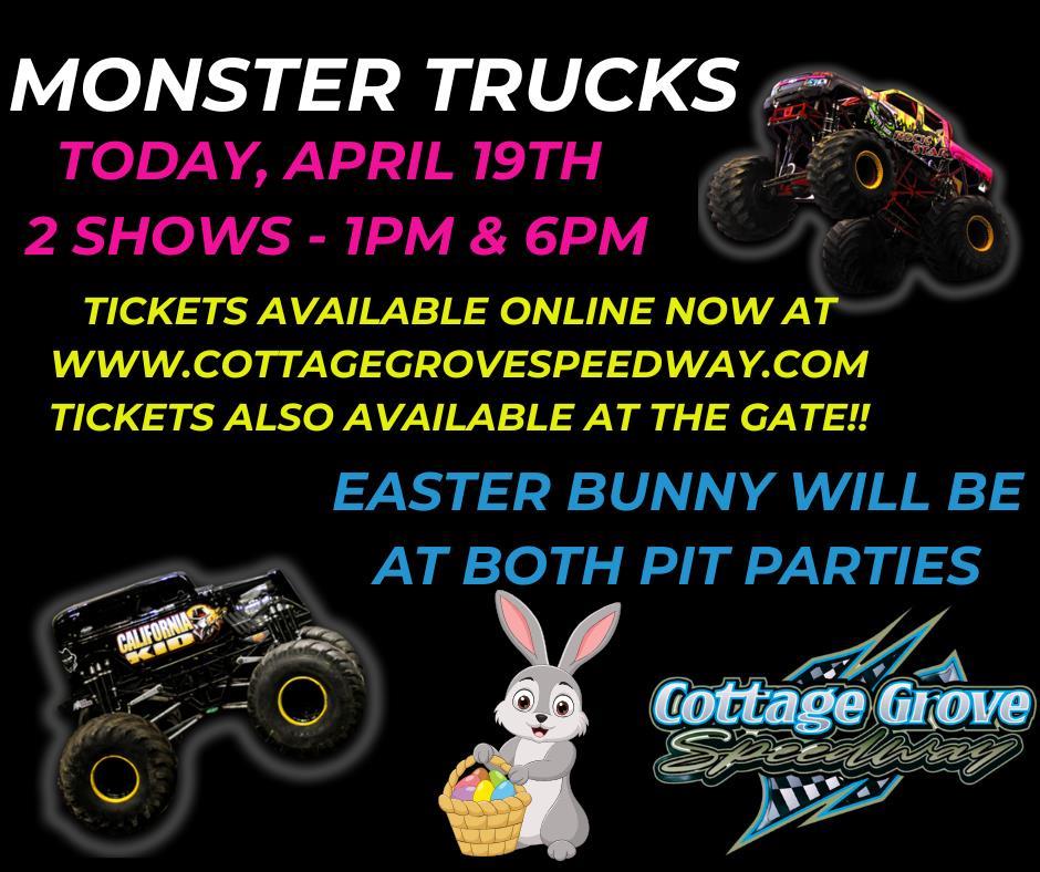 It's gonna be a great day for Monster Trucks, Megasaurus, and the Easter Bunny! Cottage Grove Speedway has it all and it's not too late to get your tickets and make your way on down to the show!