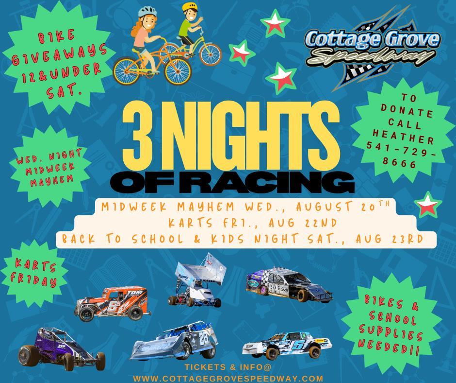 The party and the racing never stops here at Cottage Grove Speedway as we bring you another 3 nights of action packed, heart pounding, earth shattering racing!